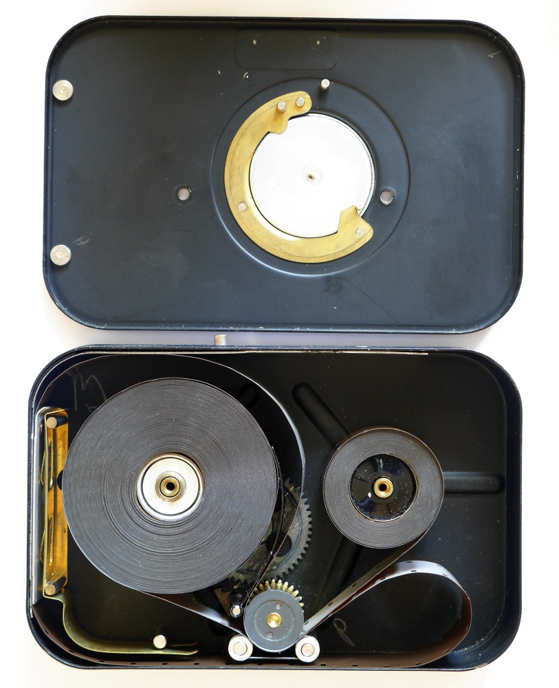Die Kodak-16mm Filmkassette für 15m Film ist sehr Aufwendig aufgebaut. Der Deckel ist mit zwei Schrauben befestigt, im Deckel befindet sich die Abtastung des Filmwickels mit der Anzeige des Filmvorrats. In der Kassette wird der Film durch eine Zahntrommel transportiert, die über eine Kupplung vom Gehäuse aus angetrieben wird. Das Bildfenster ist Bestandteil der Kassette und ist mit einem Stahlband verschlossen, das auch den Greifereintritt abdeckt. Beim Schließen und Verriegeln der Kamera wird das Band durch den Deckelverschluss zurückgezogen und in Stellung ´Lauf` das Bildfenster und der Greifereintritt freigegeben, so ist ein Filmwechsel ohne Bildverlust möglich.