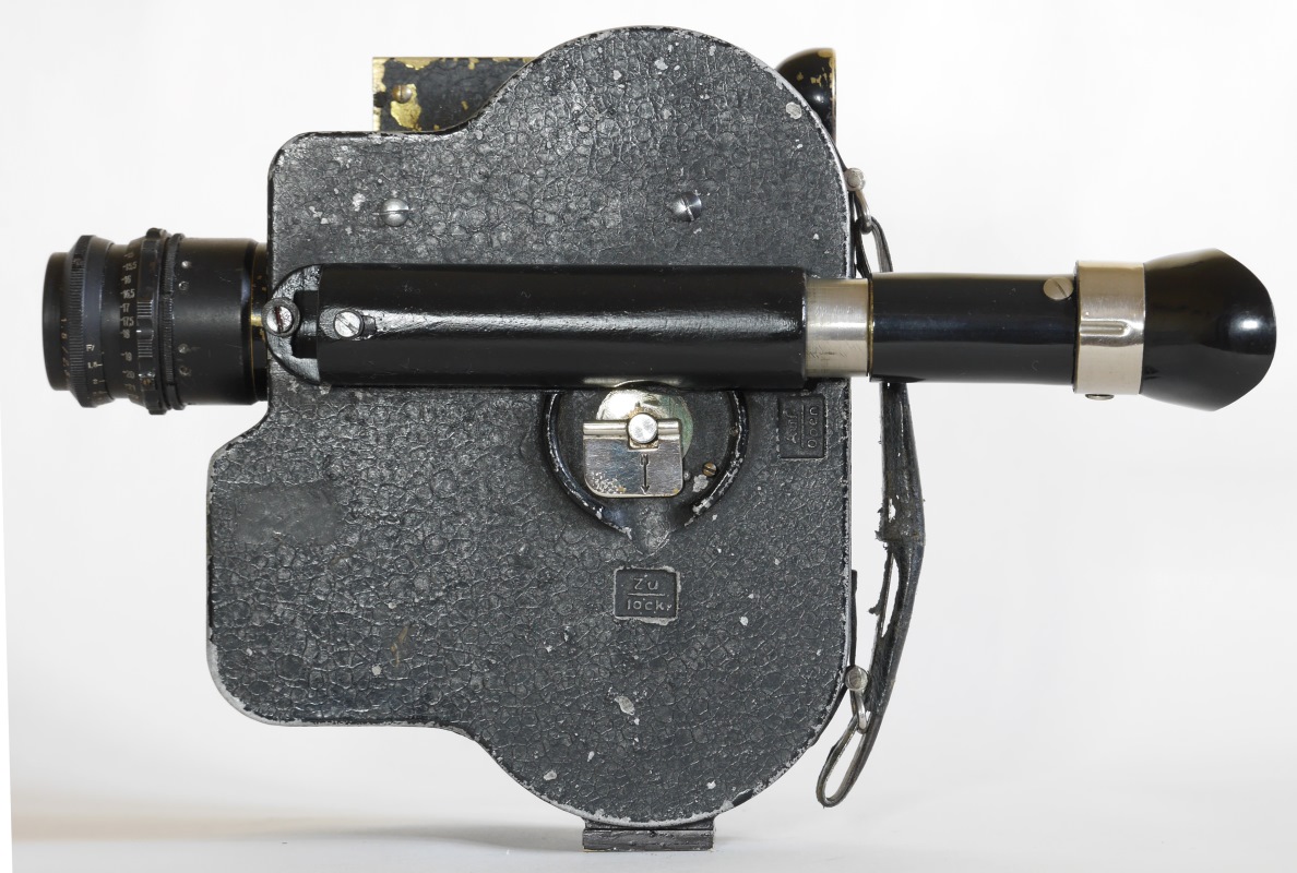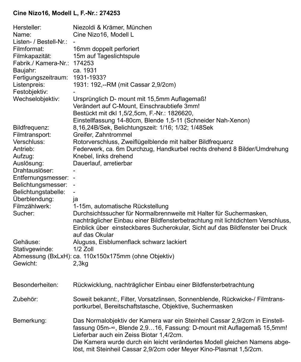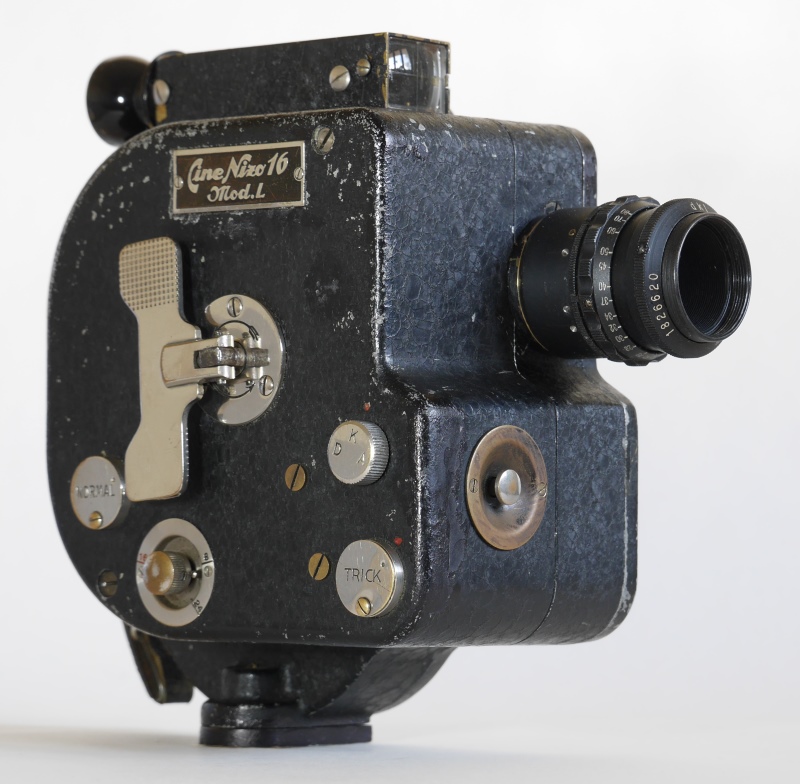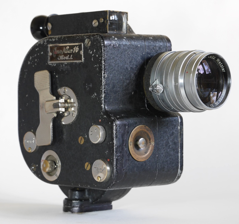 Eine 16mm-Kamera aus dem Jahr 1931 ist die CineNizo 16 Modell L für die damals üblichen 15m Tageslichtspulen. Ein Schwergewicht von ca. 2,3kg aus Alu-Guss, solide und robust aufgebaut, die Bildfrequenz zwischen 8 und 24 B/Sek. stufenlos einstellbar. Zusätzlich zum Federwerk ist ein Anschluss für den Betrieb mit einer Handkurbel vorgesehen (8 Bildern/Umdrehung). Ein weiterer Anschluss ermöglicht die Rückwicklung des Films für Trickaufnahmen. Um Unwucht zu vermeiden, ist die Sektorenblende als Zweiflügelblende ausgelegt und dreht mit halber Bildfrequenz. Ungewöhnlich für eine 16mm-Kamera ist der Objektivanschluss, ein D-mount mit dem Auflagemaß von 15,5mm, der vielleicht von den 9,5mm-Kameras übernommen wurde. Das Normalobjektiv ist ein Steinheil Cassar 2,9/2cm in Einstellfassung. Auf dem Gehäuse sitzt ein Newtonsucher für die Normalbrennweite, neben der Sucherlinse befindet sich links und rechts je eine Ansatzschraube für die Befestigung einer Suchermaske.
