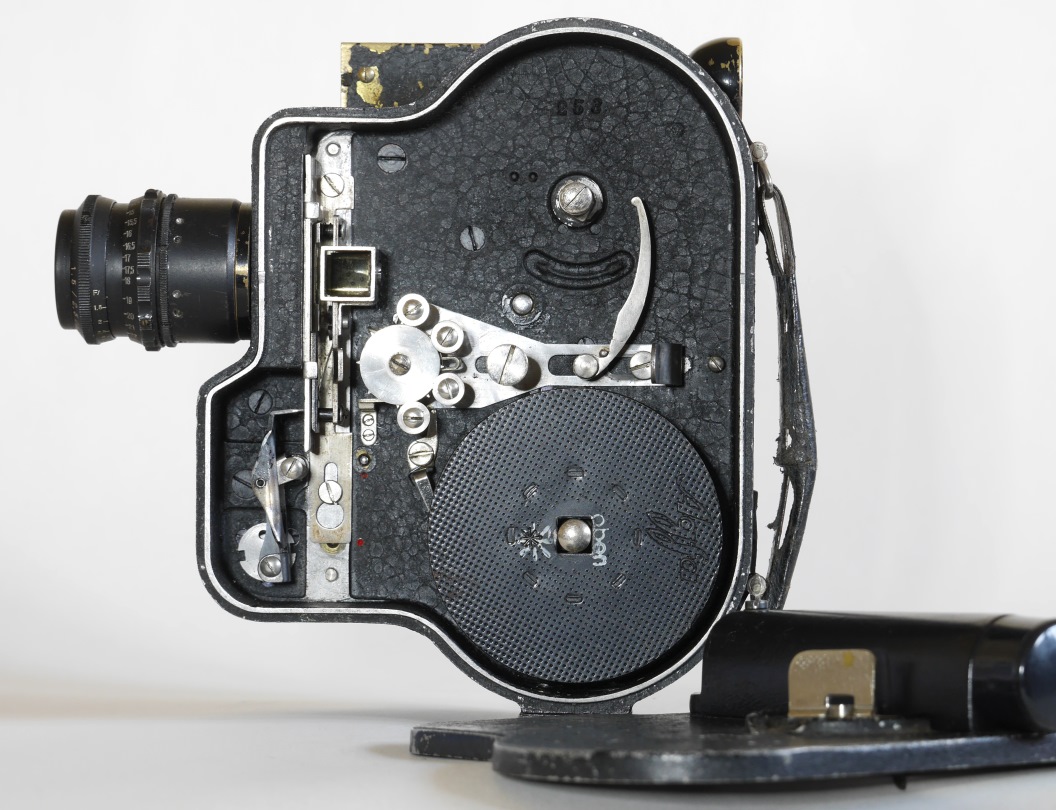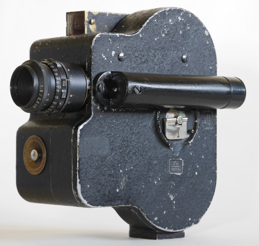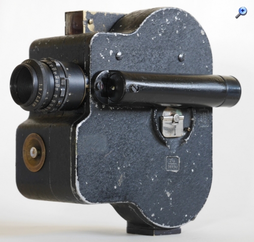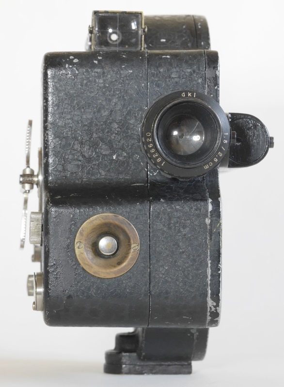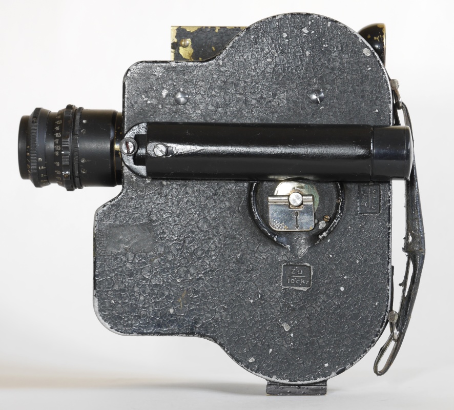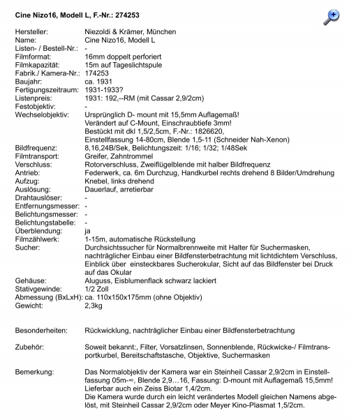 Eine 16mm-Kamera aus dem Jahr 1931 ist die CineNizo 16 Modell L für die damals üblichen 15m Tageslichtspulen. Ein Schwergewicht von ca. 2,3kg aus Alu-Guss, solide und robust aufgebaut, die Bildfrequenz zwischen 8 und 24 B/Sek. stufenlos einstellbar. Zusätzlich zum Federwerk ist ein Anschluss für den Betrieb mit einer Handkurbel vorgesehen (8 Bildern/Umdrehung). Ein weiterer Anschluss ermöglicht die Rückwicklung des Films für Trickaufnahmen. Um Unwucht zu vermeiden, ist die Sektorenblende als Zweiflügelblende ausgelegt und dreht mit halber Bildfrequenz. Ungewöhnlich für eine 16mm-Kamera ist der Objektivanschluss, ein D-mount mit dem Auflagemaß von 15,5mm, der vielleicht von den 9,5mm-Kameras übernommen wurde. Das Normalobjektiv ist ein Steinheil Cassar 2,9/2cm in Einstellfassung. Auf dem Gehäuse sitzt ein Newtonsucher für die Normalbrennweite, neben der Sucherlinse befindet sich links und rechts je eine Ansatzschraube für die Befestigung einer Suchermaske.