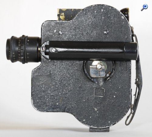 Die Kamera ist auch durch einen Sucher zur rückseitigen Betrachtung des Bildfensters ergänzt worden. Um Lichteinfall auf den Film zu vermeiden, ist im Okular ein Schieber vorgesehen, der den Strahlengang unterbricht. Durch Druck auf das Sucherokular wird der Einblick freigegeben. Eigentlich ein Relikt aus der Anfangszeit der Filmerei. Solche Suchereinrichtungen waren früher üblich, speziell bei den ersten 35mm-Kameras. Einstellungen auf den Film sind aber bei den modernen Filmen mit eingefärbter Emulsion und Rückbeschichtung nicht mehr möglich.