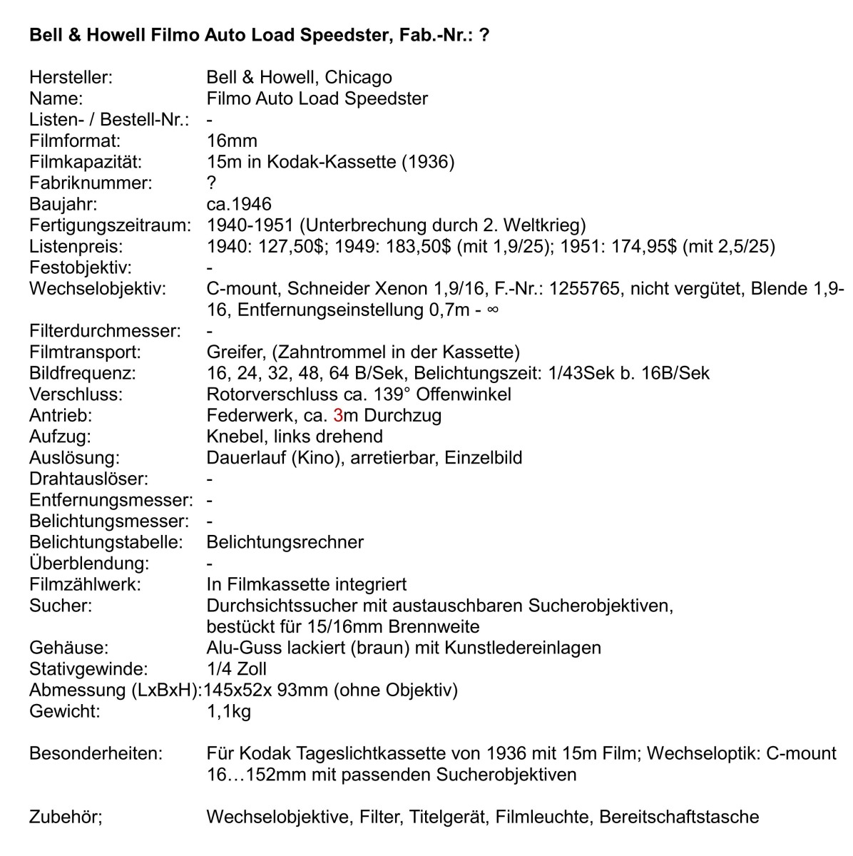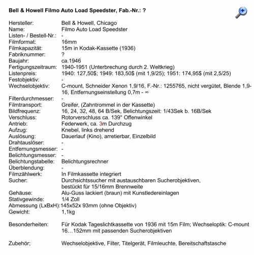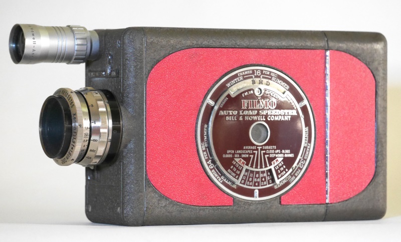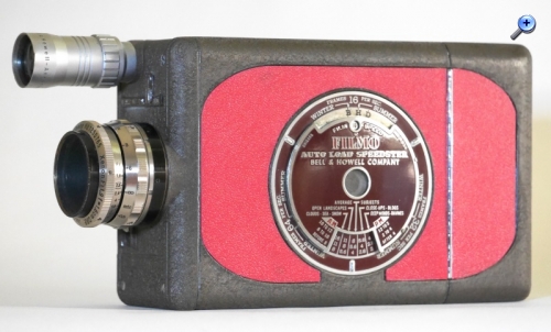 Die Filmo Auto-Load Familie wurde 1940 von Bell & Howell vorgestellt und bis 1951 gefertigt. Eine der Kameras ist die vorliegende Filmo Auto-Load Speedster, die statt 8…32B/Sek eine Bildfrequenz von 16…64B/Sek aufweist.