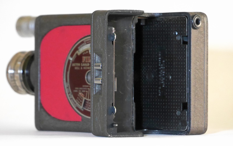 Verwendet wird das Cine-Kodak Magazin für 15m Film. Es wird von hinten eingeschoben, dabei wird das Bildfenster und der Greifereingriff der Kassette freigegeben, beim Entnehmen werden beide wieder abgedeckt.
