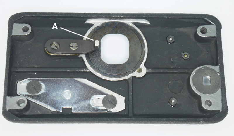 Auch bei dieser Kamera wird das Anlagemaß für die Kodak-Kassette justiert (Siehe Magazin Cine-Kodak). Ein am Objektivanschluss angeschraubter und verklebter Winkel (A) dient als Anschlag für die Kassette. Das Ende wird auf 0,59 Zoll Abstand zur Objektivauflage abgeglichen, damit das Auflagemaß von 0,69 Zoll (0,59 Zoll plus Kodak-Kassette 0,1 Zoll) zum Bildfenster der Kassette eingehalten wird.