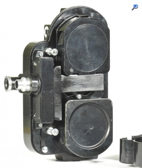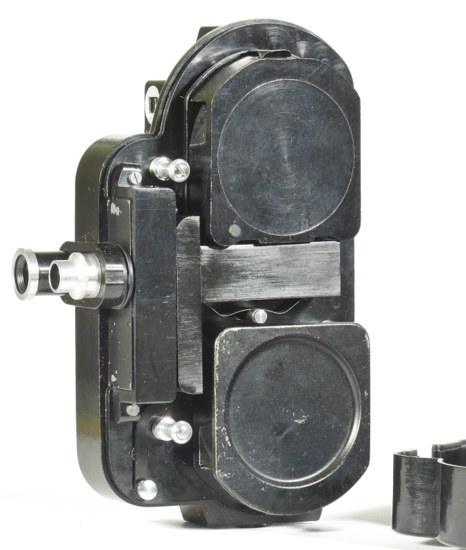 Die Kamera bestand aus Bakelit, auch die innen liegende Platine, die Schwungmasse und die restlichen Teile waren aus Messingblech gefertigt. Im Gegensatz zur Kamera war der mitgelieferte Handgriff bzw. Standfuß aus Metall sehr massiv.