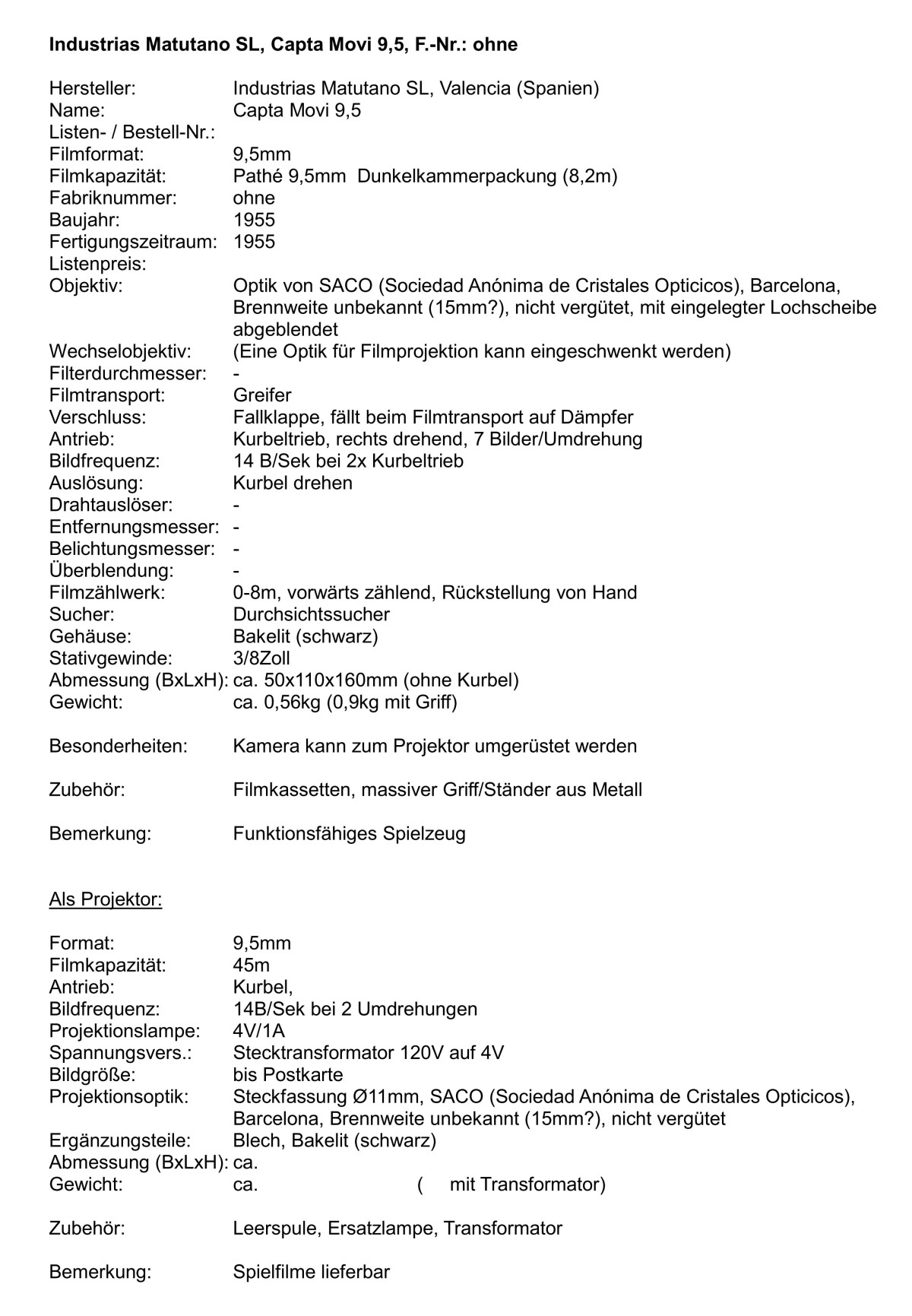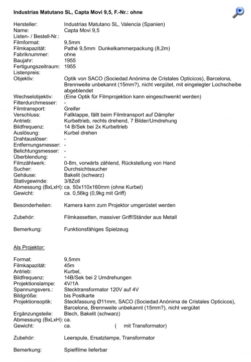 Der oder das CAPTA-MOVI von 1955 passte eigentlich nicht in das Fertigungsprogramm der Firma, es war eine einfache Filmkamera mit Kurbelantrieb für das zu dieser Zeit nicht mehr aktuelle Filmformat 9,5mm, Mehr ein Spielzeug, das aber mit 9,5mm Dunkelkammerpackungen geladen werden konnte und funktionierte. Der Antrieb erfolgte durch eine Kurbel mit 7 Bildern/Umdrehung, dabei wurde über eine Kurve eine Fallklappe zur Belichtung angehoben und beim Filmtransport auf einen Puffer fallen gelassen. Das Fixfokus-Objektiv hatte eine feste Blende, Einfluss auf die Belichtung hatte man nicht.